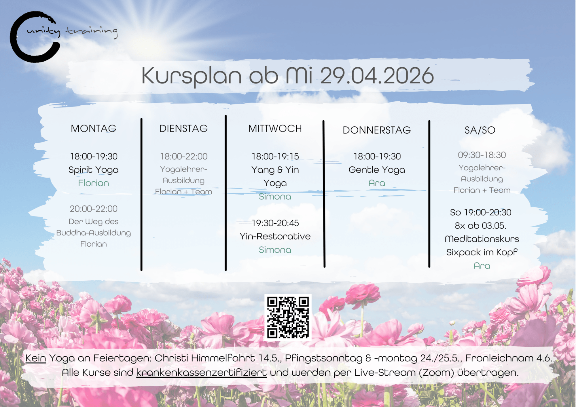 Oben siehst du unsere Präsenz- und Live Streaming Angebote. Um dich einzubuchen, wähle oben im Kursplan den Kurs aus an dem du teilnehmen möchtest.